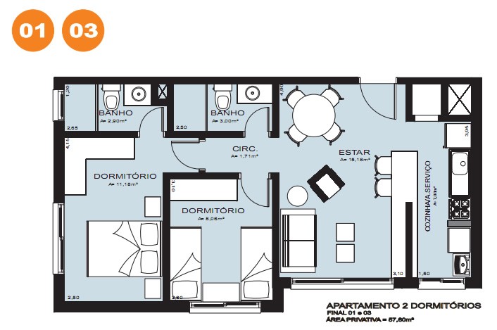* 02 unidades de 02 dormitórios + 03 unidades de 01 dormitório